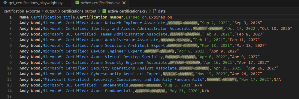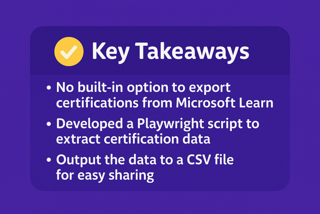 Recently I was asked by my employer to provide an up‑to‑date export of all my Microsoft certifications. Straightforward enough, right? I’d just renewed a bunch of them, and as a Microsoft Partner they like to keep track of everyone’s achievements. A quick CSV would do the job.